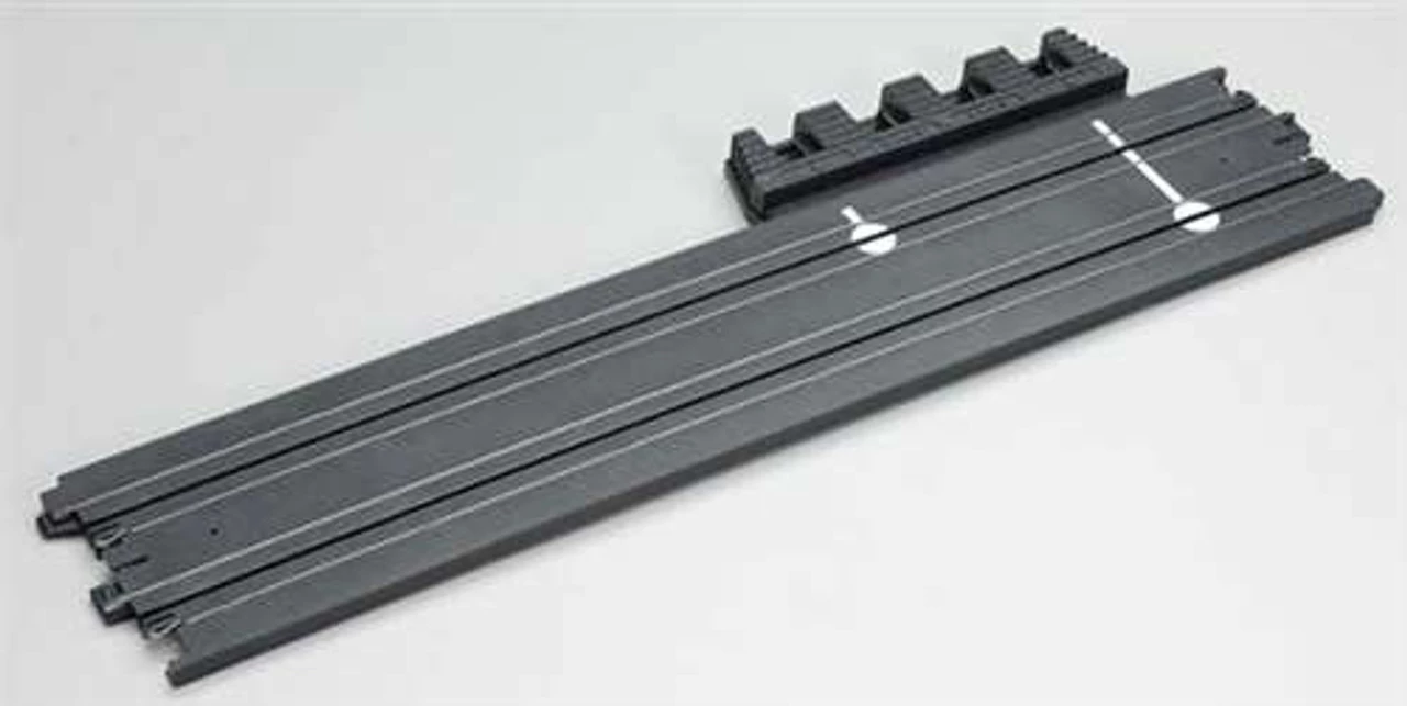 This is the AFX Slot Car Track Dual Power Pack Terminal Section, for use with AFX HO slot car tracks. Again, only AFX has it! With the Pro Power Terminal Track you can connect two power packs – one for each lane. This lets each driver have their own power source. So, when one car goes off the other one doesn’t get that momentary surge of power that can be just enough to put you off the track just when you thought you had him.