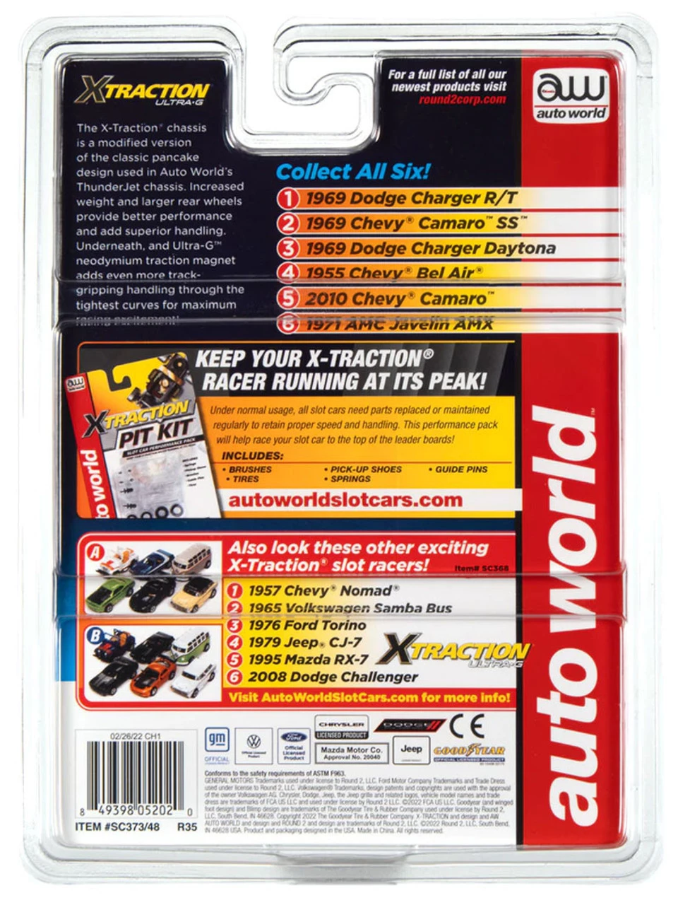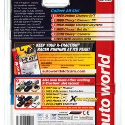 The X-Traction chassis is a modified version of the classic pancake design used in Auto World’s ThunderJet Chassis. Increased weight and larger rear wheels provide better performance and superior handling. Underneath, and Ultra-G neodymium traction magnet adds even more track-gripping handling through the tightest curves for maximum racing excitement!