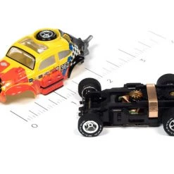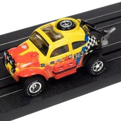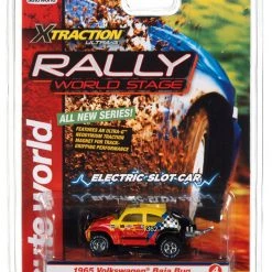 This is the Rally World Stage Auto World 1965 Volkswagen Baja Bug (Red, Yellow) X-Traction HO Slot Car.
