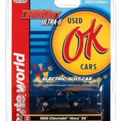 This is the OK USED CARS Auto World 1969 Chevrolet Nova S (Blue) Thunderjet HO Slot Car