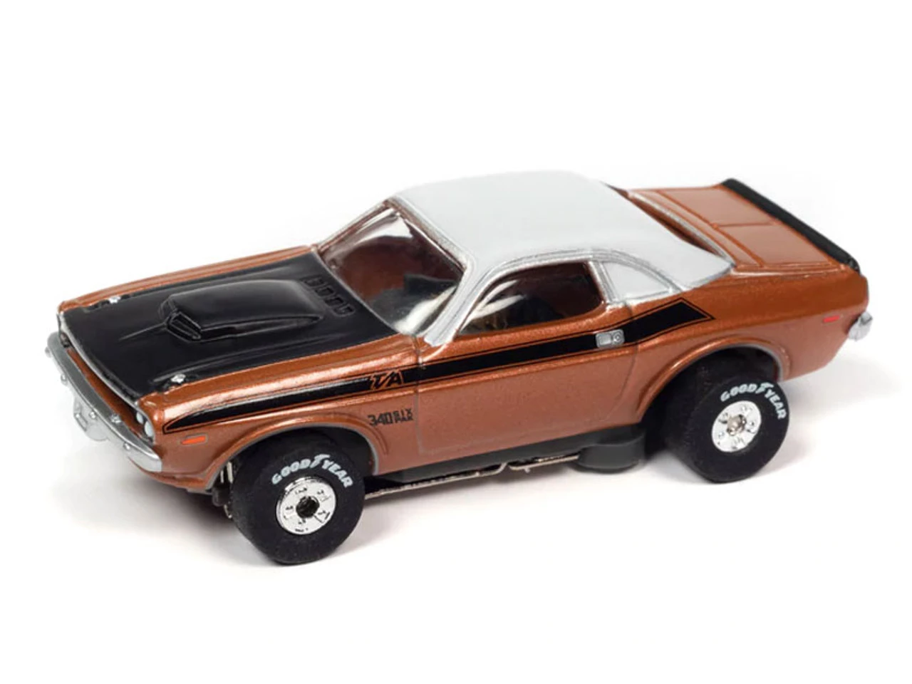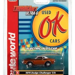 This is the OK USED CARS Auto World 1970 Dodge Challenger T/A (Burnt Orange) Thunderjet HO Slot Car