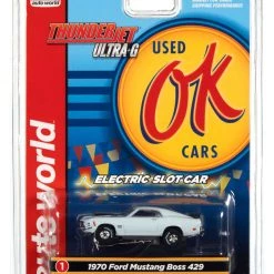 This is the OK USED CARS Auto World 1970 Ford Mustang Boss 429 (Blue) Thunderjet HO Slot Car