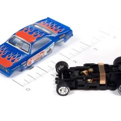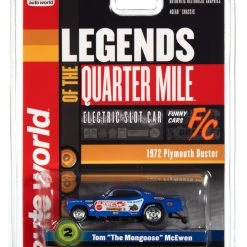 This is the LEGENDS OF THE QUARTER MILE Auto World 1972 Plymouth Duster Funny Car (Blue w/Flames) Tom “The Mongoose” McEwen Mongoose II 4Gear Legends HO Slot Car