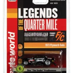 This is the LEGENDS OF THE QUARTER MILE Auto World 1973 Plymouth Cuda Funny Car (Black) Don “The Snake” Prudhomme 4Gear Legends HO Slot Car