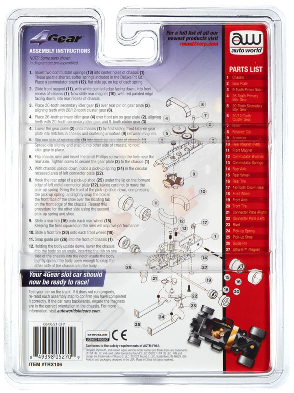 Build a complete 4GEAR Slot Car – Includes an unpainted 1970s Plymouth Cuda Funny Car Body.