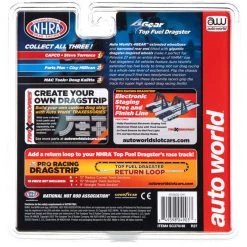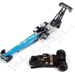 Auto World’s 4GEAR extended wheelbase and narrowed rear end fitted with gigantic dragster-inspired wheels make it perfect for Release 27 with an entire line-up of NHRA top fuel dragsters! All vehicles feature Auto World’s extended top fuel body to bring slot car racing to a whole new level of excitement. Flip the chassis over and you’ll find two neodymium traction magnets to make these dynamic racers grip the track for super high speed drag racing thrills!