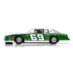 This is the Scalextric 1986 Chevrolet Monte Carlo number 69 ‘VELOCITY’ Green/White 1/32 Analog Slot Car. The Chevrolet Monte Carlo was first produced in 1970 as a two-door coupe. It has since been through six generations, last rolling off the production line in 2007. The 1986 Chevy Monte Carlo was the fourth generation of the popular car, which had a number of variations from previous iterations. The 1986 car was also used privately in several racing events, including the incredibly popular NASCAR series in the US.