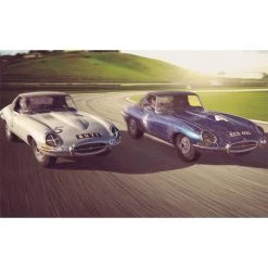 This is the Scalextric Jaguar E-Type First Win 1961 Twin Pack 1/32 Analog Slot Cars. This was the first race and the first win for the iconic Jaguar E-Type! A great performance by both famous drivers saw the racing career of the E-Type get off to a fantastic start.